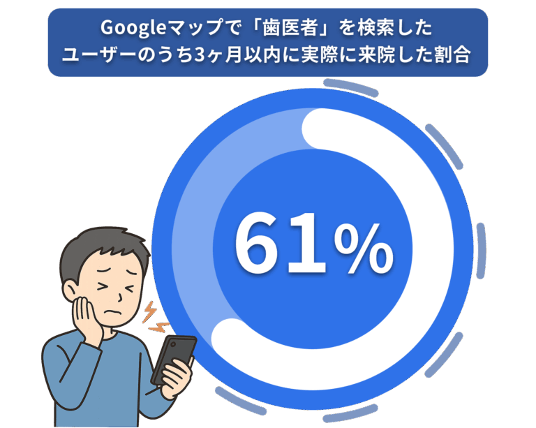 ※出典:【調査レポート】61%のユーザーがGoogleマップ上での行動後に来院したと回答。ウェブサイトクリックとルート検索の組み合わせが最も高い来院率に(株式会社トライハッチのプレスリリース)